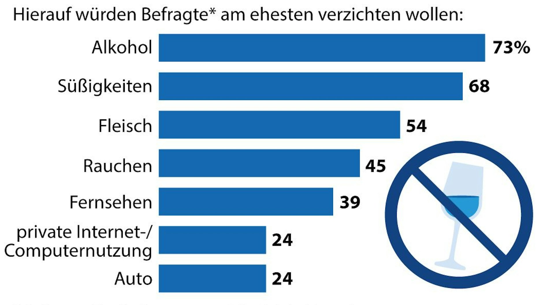 Nach einer aktuellen Umfrage der Krankenkasse DAK Gesundheit verzichteten 64 Prozent schon einmal für mehrere Wochen gezielt auf ein bestimmtes Genussmittel oder auf Konsumgüter. Vor der Fastenzeit gaben mit 73 Prozent fast drei Viertel an, in diesem Jahr auf Alkohol verzichten zu wollen.
