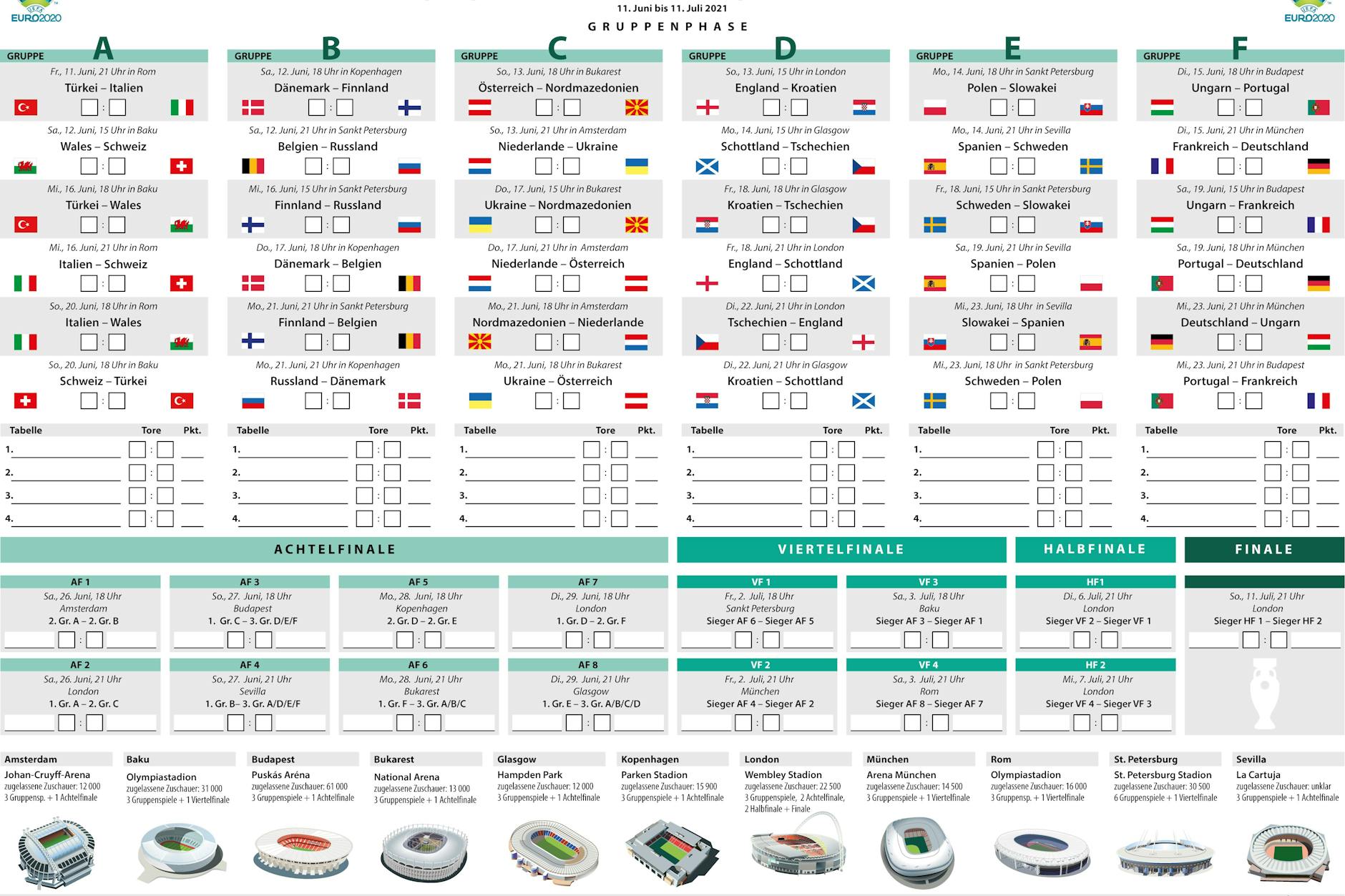 Der Spielplan im Überblick vom Tag der Eröffnung am 11. Juni bis zum Finale am 11. Juli