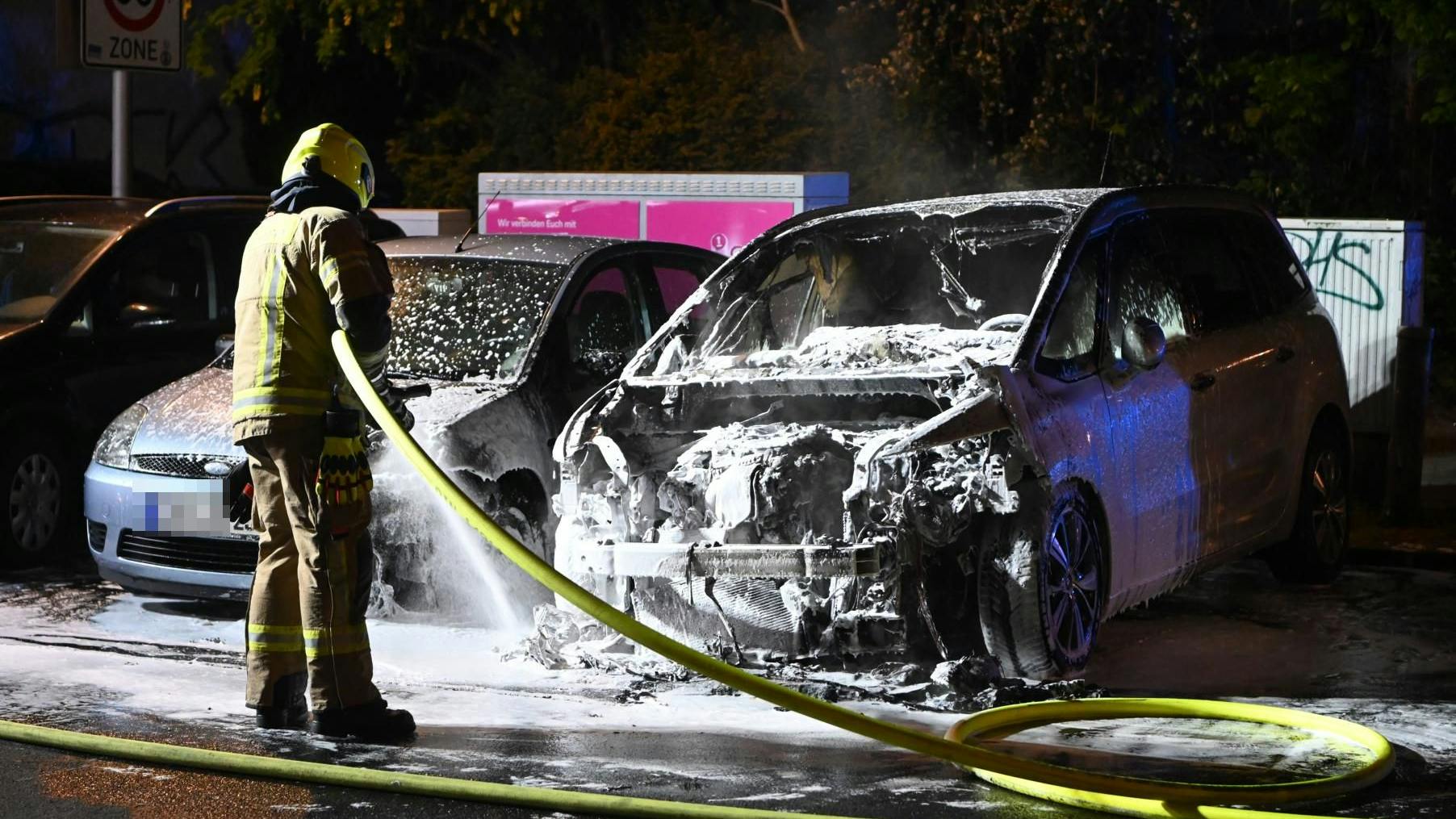 Am Donnerstag kurz vor Mitternacht brannte auf der Fritz-Erler-Allee ein Mercedes. Die Feuerwehr löschte den Brand im Frontbereich. Die Polizei ermittelt.