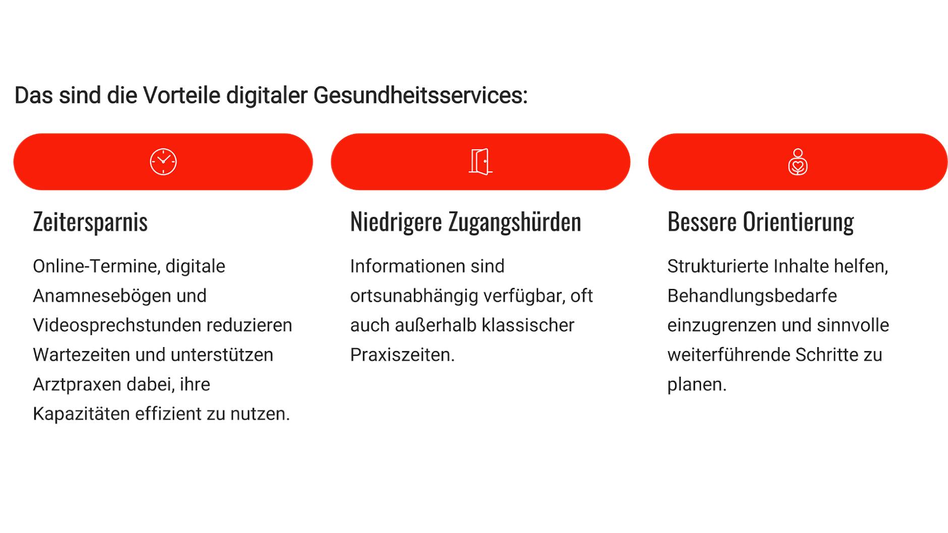 Digitale Angebote ersetzen keine ärztliche Diagnose oder Therapie. Sie dienen als unterstützendes Werkzeug, um informierte Entscheidungen zu treffen, Teilprozesse zu automatisieren und von Praxiskapazitäten unabhängiger zu machen und den Kontakt zum Gesundheitssystem effizienter zu gestalten.