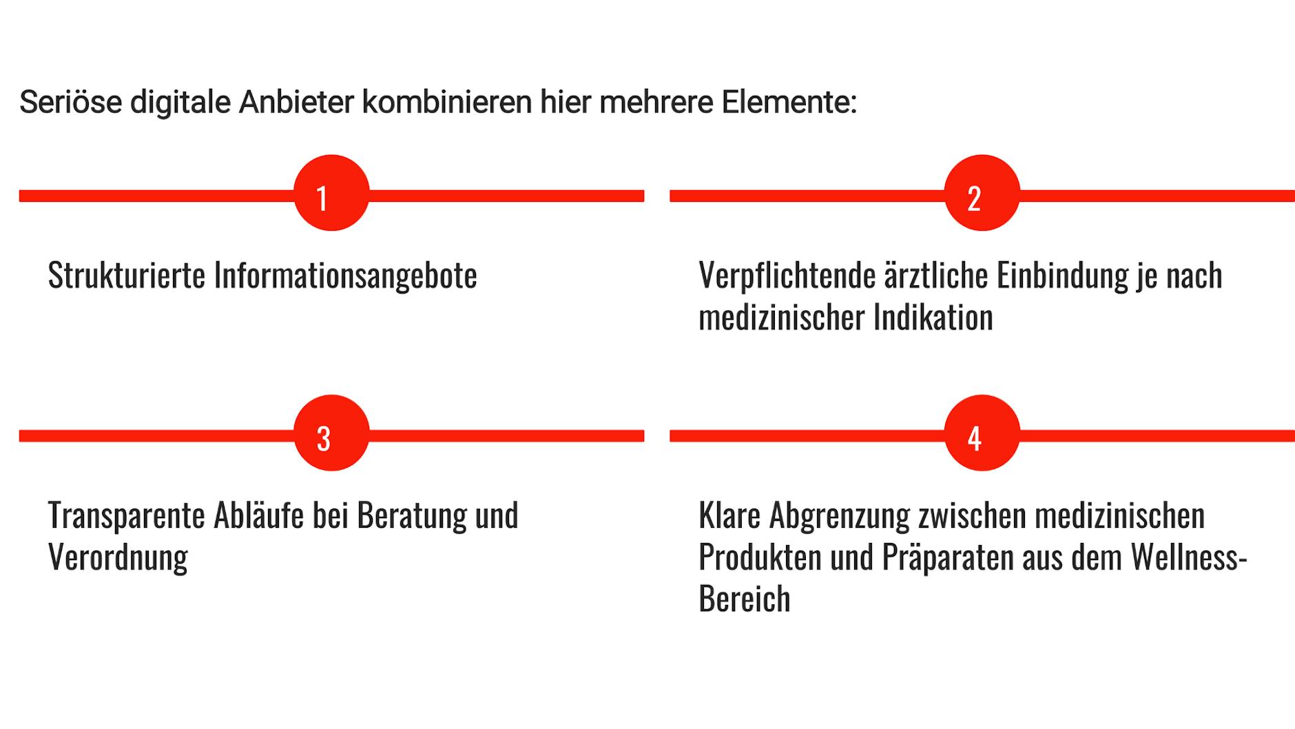 Wesentliche Grundlage bleibt die fachärztliche Beratung und Einschätzung, die durch digitale Beratungsangebote ergänzt wird. Sie können dabei helfen, Informationen zu Darreichungsformen, rechtlichen Voraussetzungen oder organisatorischen Abläufen bereitzustellen und so ein komplexes und breit gefächertes Gebiet der medizinischen Versorgung und Prävention alltagstauglich aufzubereiten.