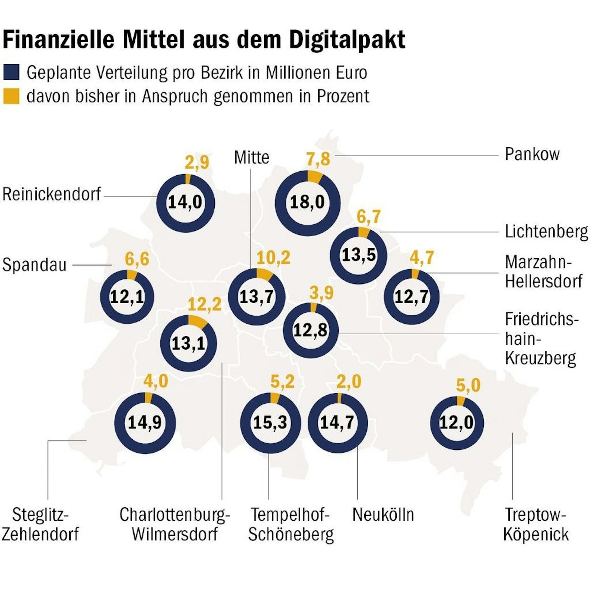 So haben die Schulen im Bezirk Charlottenburg-Wilmersdorf bisher mit Abstand am meisten angefordert. Insgesamt 1,6 Millionen Euro wurden hier von den Schulen in Anspruch genommen. Allerdings dürften die Einrichtungen im Bezirk insgesamt fast 12,8 Millionen Euro ausgeben. Neukölln ist mit seinen Anträgen bei der Senatsverwaltung das Schlusslicht in Berlin. Obwohl auch hier insgesamt 14,7 Millionen Euro für die digitale Ausstattung der Schulen zur Verfügung stehen, wurden bisher erst 291.523,15 Euro abgerufen. Das sind gerade mal zwei Prozent der Mittel. Friedrichshain-Kreuzberg hat von den zur Verfügung stehenden 12,8 Millionen erst 535.702,82 Euro in Anspruch genommen, Lichtenberg immerhin 930.000. Dort kann man insgesamt 13,4 Millionen Euro verteilen.
