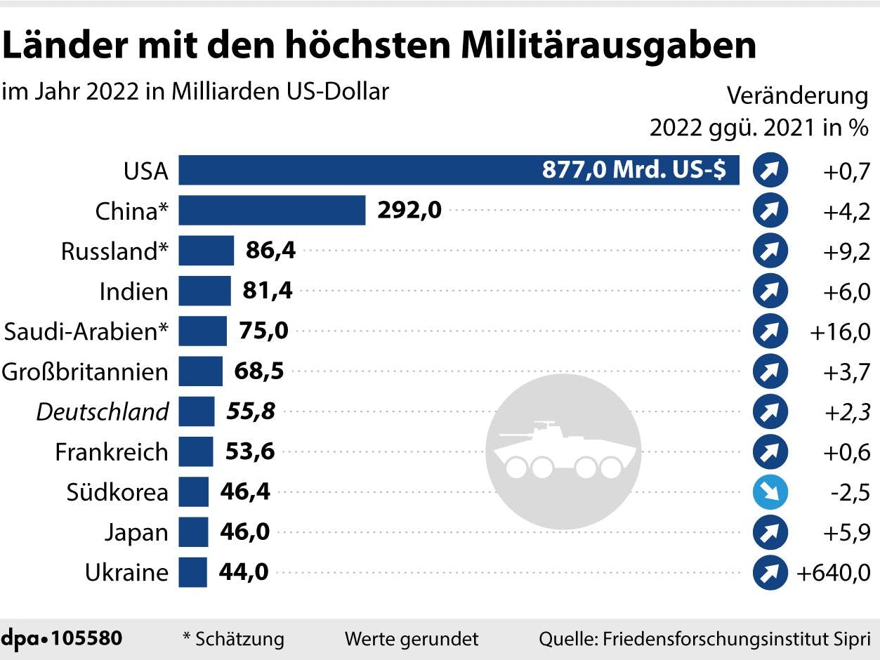 Neuer Höchststand bei den weltweiten Militärausgaben: Vor allem wegen des russischen Angriffskriegs gegen die Ukraine stiegen sie 2022 inflationsbereinigt um 3,7 Prozent auf rund 2,04 Billionen Euro, teilte das Stockholmer Friedensforschungsinstitut Sipri am Montag mitteilte. Die Staaten der Erde steckten somit auch im achten Jahr in Folge mehr Geld ins Militär. Inflation inbegriffen, würde der Anstieg bei 6,5 Prozent liegen. Die USA bleiben klarer Spitzenreiter, Deutschland Siebter.