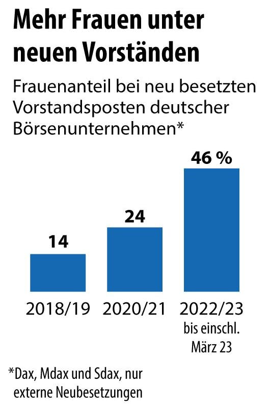 Bei der Neubesetzung von Vorstandsposten in börsennotierten deutschen Unternehmen rücken die Frauen vor. Nach einer Studie der Allbright-Stiftung wurden zwischen September 2022 und März 2023 für fast die Hälfte aller neu zu besetzenden Vorstandsjobs Managerinnen von außen geholt. Das sei eine ungewöhnlich starke Dynamik.