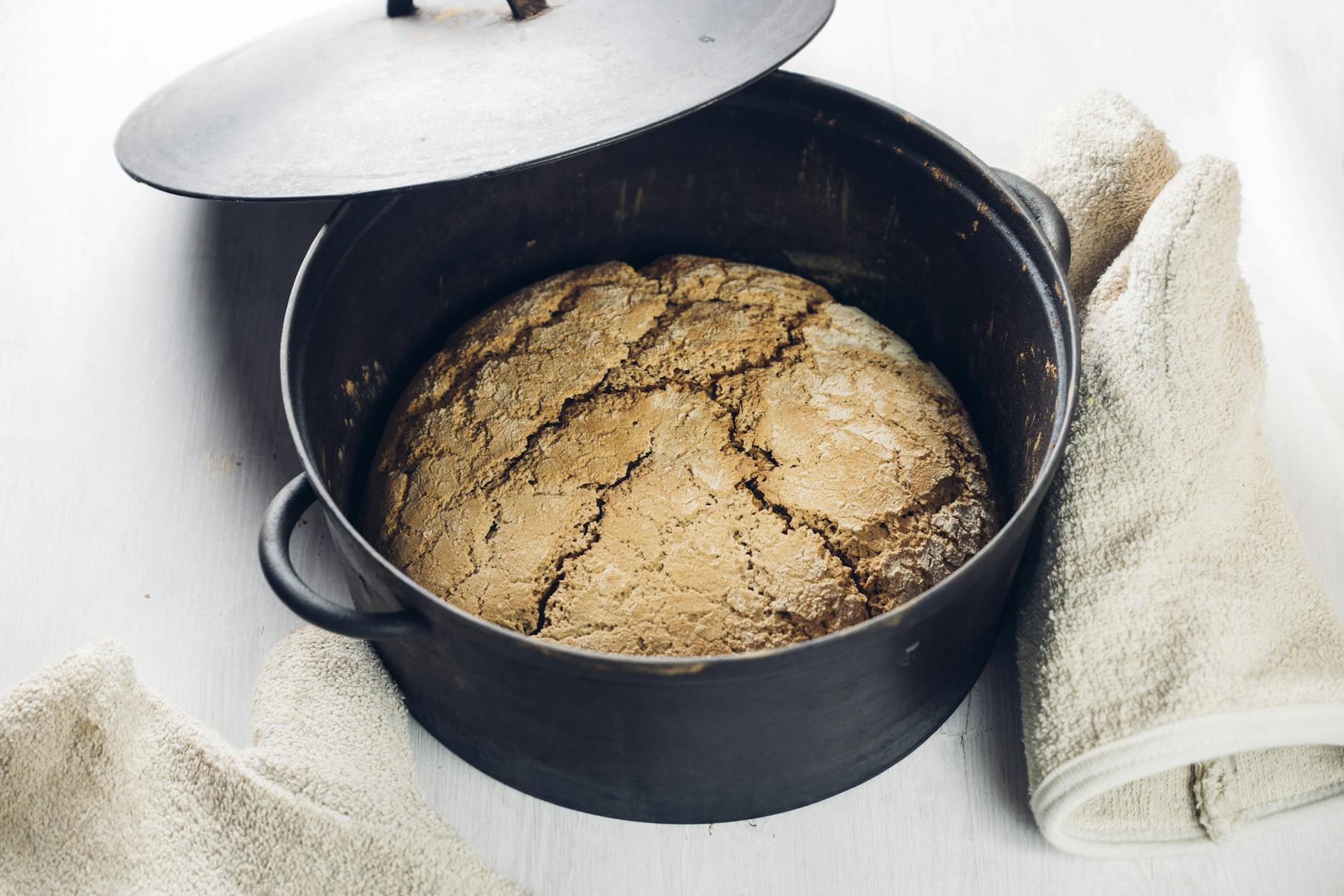 Wenn Brot im geschlossenen Topf und nicht etwa auf dem Backblech gebacken wird, bleibt die Feuchtigkeit im Brot. Außerdem bekommt der Laib gleichmäßige Hitze von allen Seiten. Zusätzlich entsteht eine tolle Kruste. Probieren Sie es also aus, unser tolles Rezept für Brot im Topf.