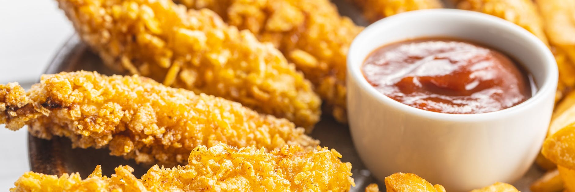 Sie brauchen: 300 Gramm Hühnerbrust, 100 Gramm Joghurt, 100 Gramm ungesüßte Cornflakes, Salz und Pfeffer