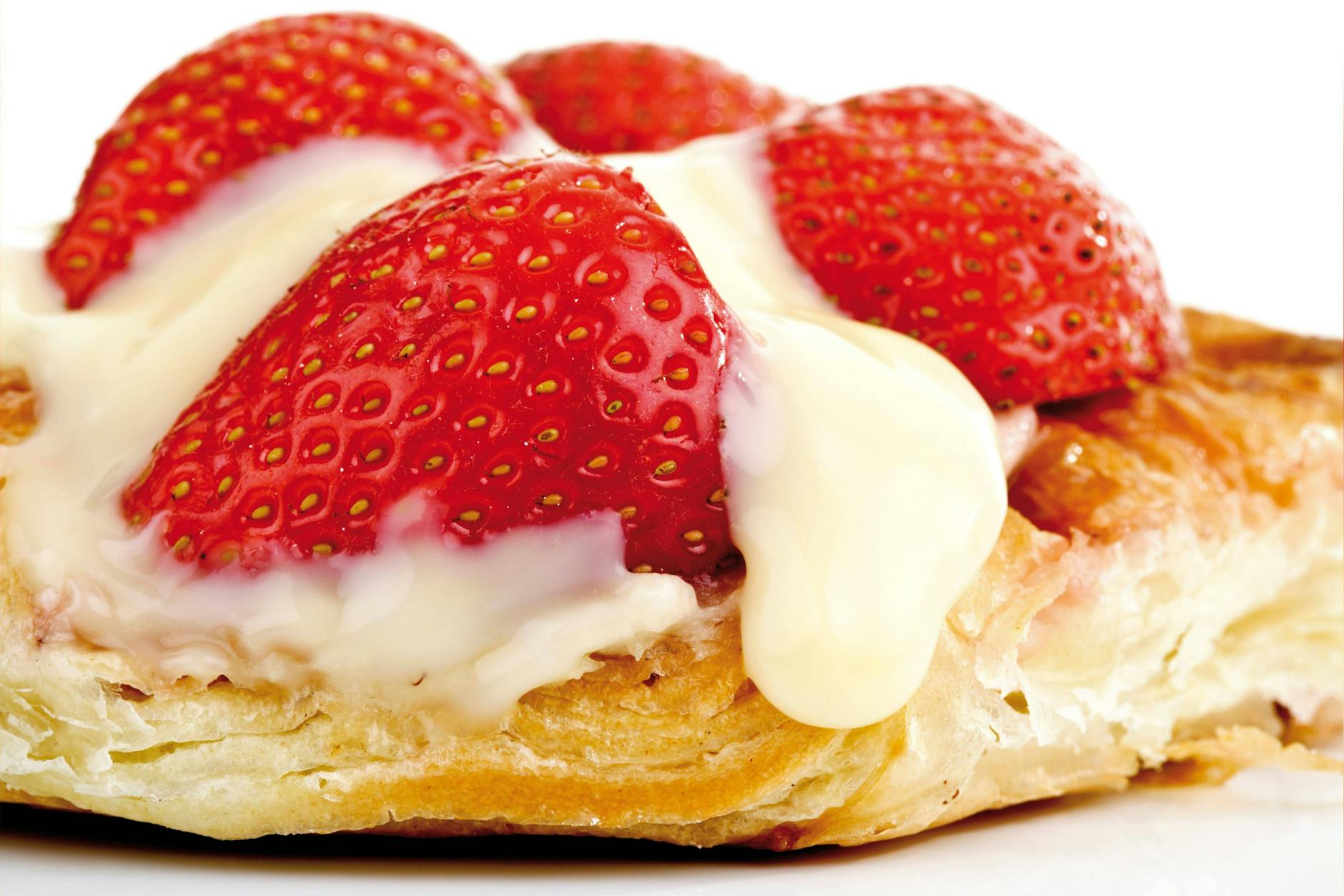 Sie brauchen: 275 Gramm Blätterteig (frisch), 250 Milliliter fettarme Milch, 1 Päckchen Puddingpulver, 100 Gramm Erdbeeren