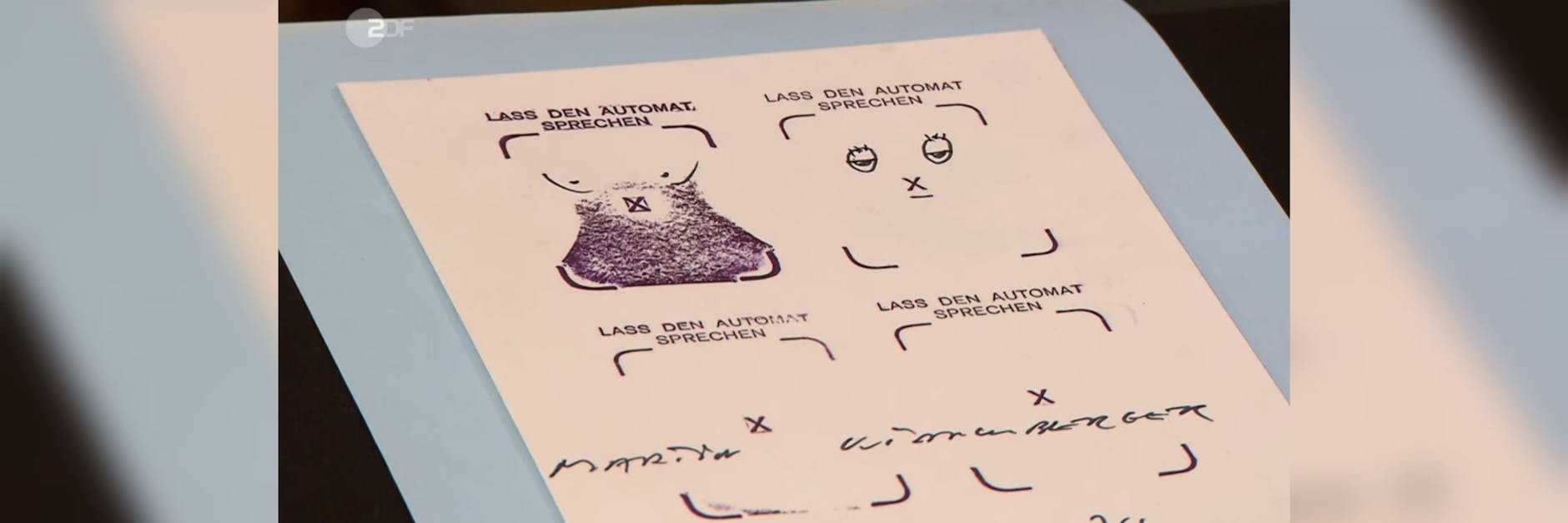 „Wir haben freie Räume. Man denkt so ein bisschen an einen Passbild-Automaten. Es steht sogar da: ‚Lass den Automat sprechen‘. In einem der Kästchen ist beim Druck etwas passiert, was nicht gewollt war, was aber aussieht wie ein Torso. Martin Kippenberger hat das direkt aufgegriffen und händisch Brüste angesetzt. Daneben hat er zu dem Kreuz – dem Mittelfeld des Fotoautomaten – einen Mund und Augen hinzugefügt“, versucht sich Detlef Kümmel in der Interpretation des Kunstwerks.