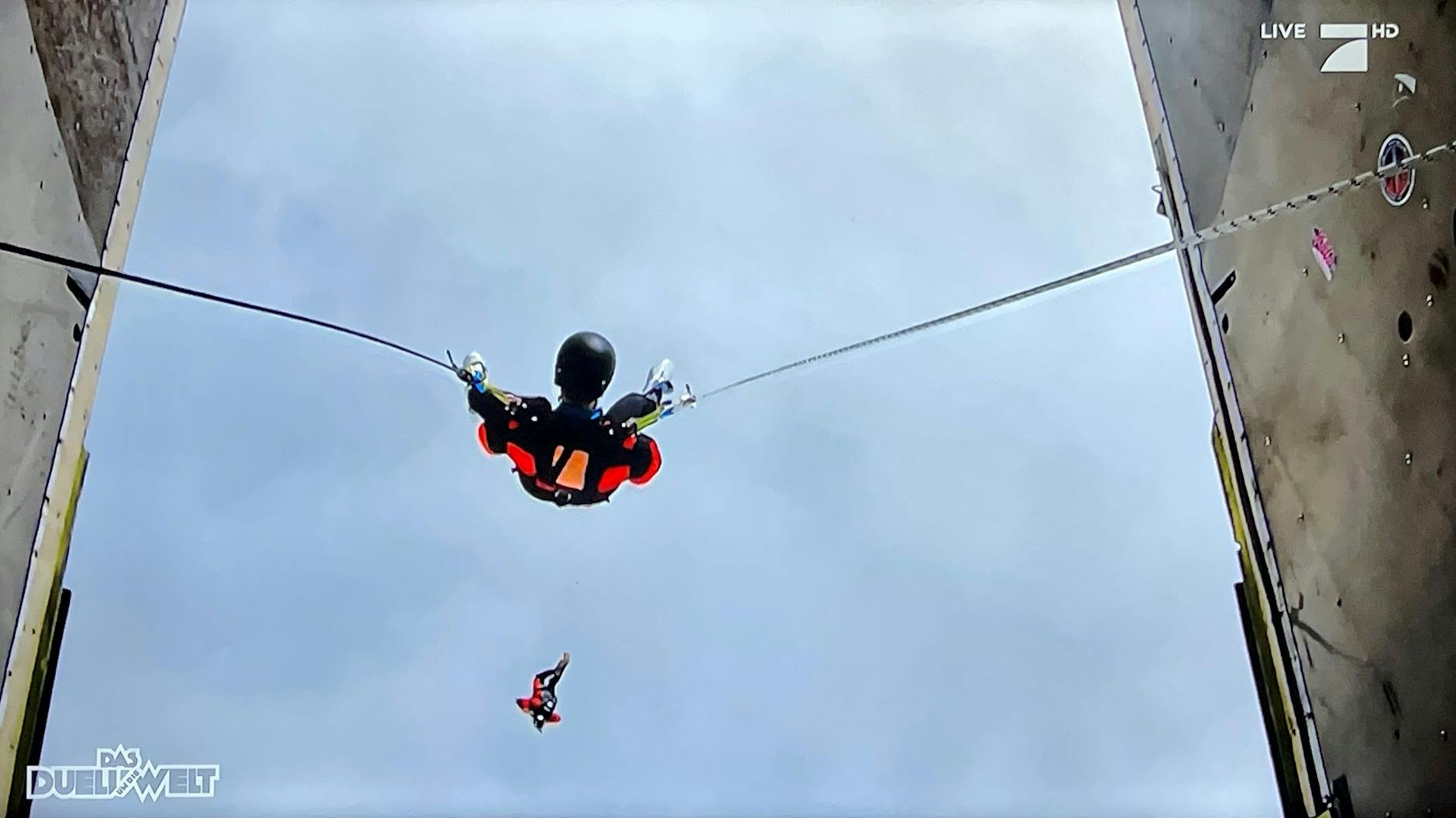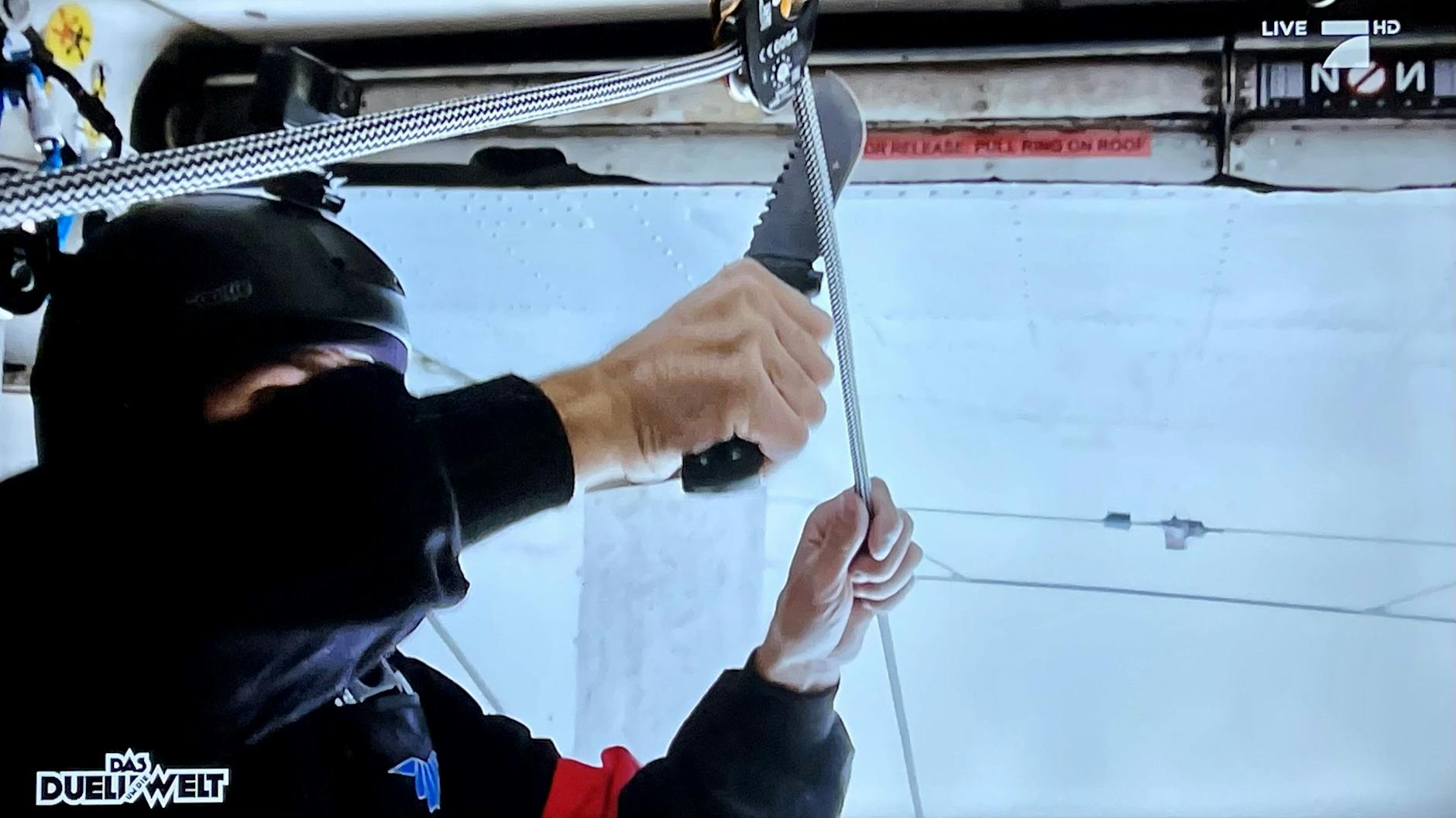 Joko erklärt eine davon: "Luke hängt an drei Sicherungsseilen, eines von denen braucht man faktisch aber nicht. Das kann man ja einfach durchschneiden, während Luke hinten aus dem Flugzeug hängt …"